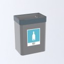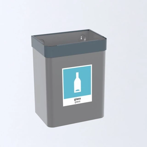 En komplett avfallsbeholder i stål med veggskinne, pulverlakkert grå. Med lysgrå topp, ferdig merket med turkis etikett for glass. Alt du trenger til vegghengt kildesortering av avfall. Varen er komplett og klart til bruk. Inkluderer: beholder, topp, etikett og sammenkoblingskit. Skinne for veggmontering inngår som standard. Beholderne lakkeres med en robust og slitesterk grafittgrå metallic pulverlakk eller i RAL 7021 Sahara som er en slitesterk gråsort pulverlakk. Toppen lakkeres etter de nasjonale fargene for kildesortering. - Mål (HxBxD): 410x310x210mm - Volum: 25L - Materiale: stål.