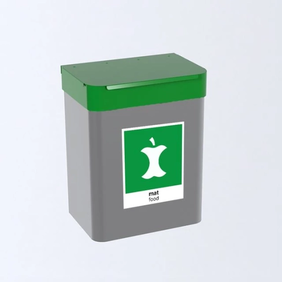En komplett avfallsbeholder i stål med veggskinne, pulverlakkert grå. Grønn topp med lokk, ferdig merket med grønn etikett for mat. Innvendig 12L bøtte og brakett. - Mål (HxBxD): 410x310x210mm - Volum: 25L - Materiale: stål.