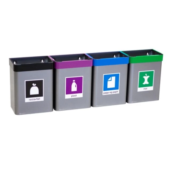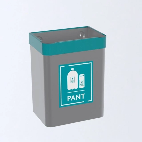 En komplett avfallsbeholder i stål med veggskinne. Turkisblå topp, ferdig merket med turkisblå etikett for pant. Alt du trenger til vegghengt kildesortering av avfall. Varen er komplett og klart til bruk. Inkluderer: beholder, topp, etikett og sammenkoblingskit. Skinne for veggmontering inngår som standard. Beholderne lakkeres med en robust og slitesterk grafittgrå metallic pulverlakk eller i RAL 7021 Sahara som er en slitesterk gråsort pulverlakk. Toppen lakkeres etter de nasjonale fargene for kildesortering. - Mål (HxBxD): 410x310x210mm - Volum: 25L - Materiale: stål.