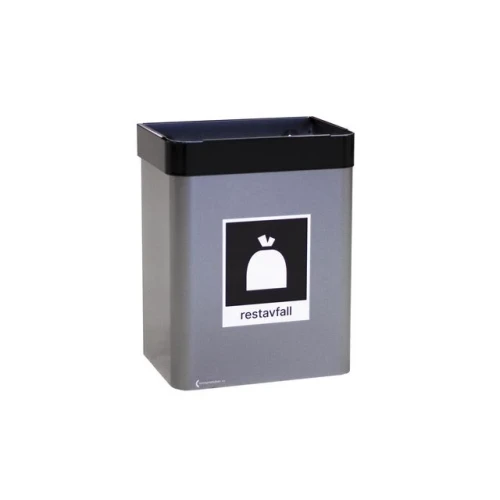 En komplett avfallsbeholder for vegg med svart topp og etikett'restavfall' påsatt sargen. Det finnes veggskinne for 2, 3 eller 4 beholdere som kan bestilles i tillegg. Praktisk for å få de i et rigid system og med færre skruehull i veggen.