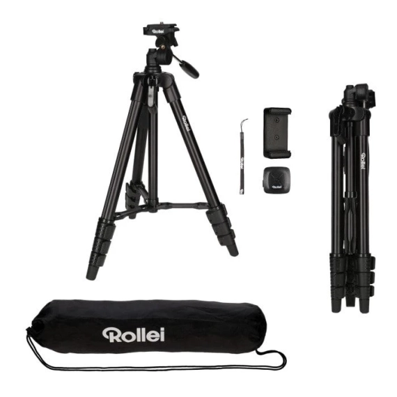 Rollei Smartphone Tripod Traveler Tripod with integrated holder for Bluetooth® remote control as well as smartphone holder Compact, flexible and ultra light weight tripod Rubber feet for more stability on smooth surfaces Integrated head with spirtit level and 1/4“ screw Bluetooth® Remote Control Smartphone Bluetooth® wireless connection (3.0) – up to 10 meter IOS5.0 or above, Android 2.3.6 or above supported Power supply: Built-in 3.0 V/ 2032 button battery