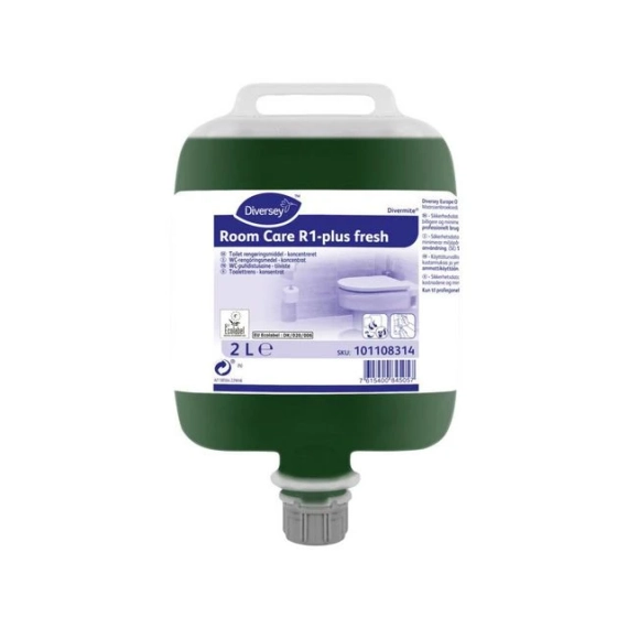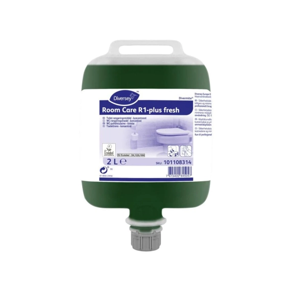 Høykonsentrert, alkalisk og flytende WC-rens til daglig rengjøring av toaletter og urinaler. Room Care R1-plus fresh fjerner effektivt flekker og avleiringer fra toalettskåler og urinaler. Dette produktet er tyktflytende og blir hengende på flaten for optimal effekt. Enkel og korrekt dosering med divermitedispenser. - Fjerner vond lukt - Med farge og parfyme - pH-verdi: 10 - Fare- og sikkerhetsinformasjon: - EUH 210: sikkerhetsdatablad er tilgjengelig på anmodning