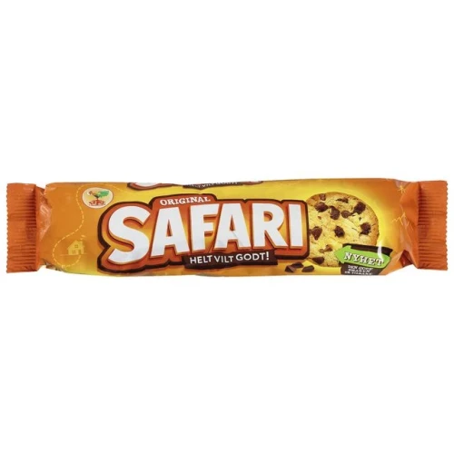 Kjeks med sjokoladebiter. Den milde smaken gjør at cookiene til Safari passer for alle, store som små. - Allergener: gluten, soya, melk - Helt vilt godt - Vekt: 200 gram.