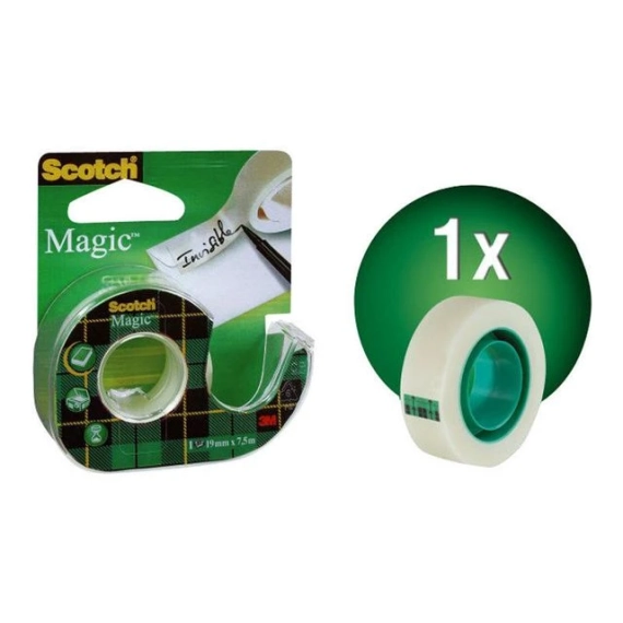 Scotch® Magic™-teipen er klar når den påføres og er et flott alternativ til lim når det gjelder å reparere papirrifter i bøker eller andre viktige papirprodukter. Den jevne og matte overflaten gjør at den også er lite synlig på fotokopier. Denne gjennomsiktige teipen av høy kvalitet kan brukes til å teipe papp, feste papir eller pakke inn små pakker. Den kan også brukes til merking siden den kan skrives på med penn, blyant eller merkepenn. Du kan lett rive denne teipen for hånd eller bruke den praktiske hånddispenseren som gjør det enda enklere å kutte, spole av og håndtere. Den kan brukes til mange forskjellige formål hjemme, på skolen eller på arbeidsplassen. Ettersom teipen ikke tørker ut og eller blir gul over tid, beholder dokumentene dine også alltid det profesjonelle utseendet. Hver teiprull måler 19 mm x 7,5 m og leveres i en hånddispenser av plast.
