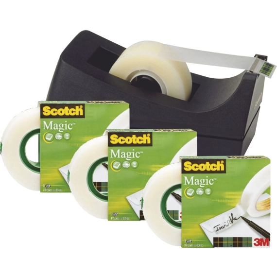 Kontortape som er lett å trekke av rullen og kutte i en dispenser Tapen er usynlig på underlaget, gulner ikke og svekkes ikke med tiden - Kan skrives på og er usynlig ved kopiering - Pakningen inneholder 1 borddispenser og 4 pk tape - Mål: 19 mm x 33 m