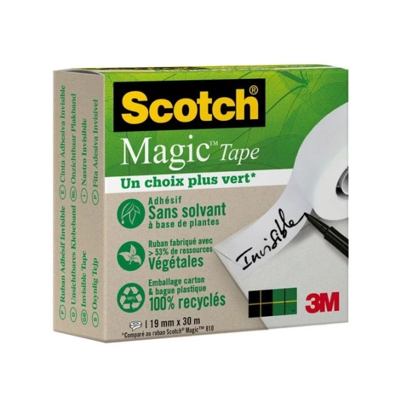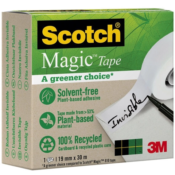 Den miljøvennlige usynlige Scotch® Magic™-teipen er et miljøvennlig alternativ til den opprinnelige Scotch® Magic™-teipen som et festemiddel og etikett.