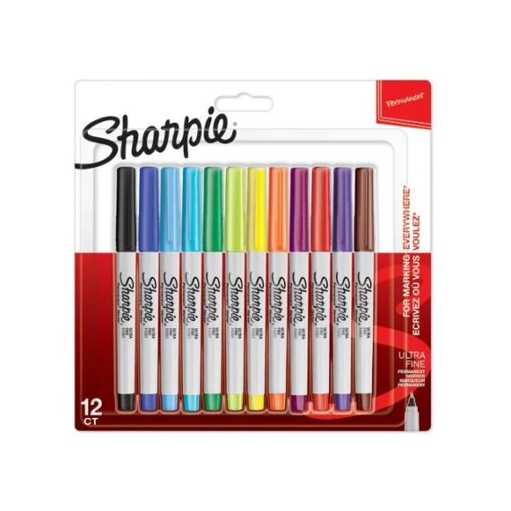 Sharpie Permanent Merkepenn Ultra Fine Assorterte Farger 12 stk i blisterpakke, kvalitetsmerkepenner med tynn spiss. Strekbredde: 0,5mm