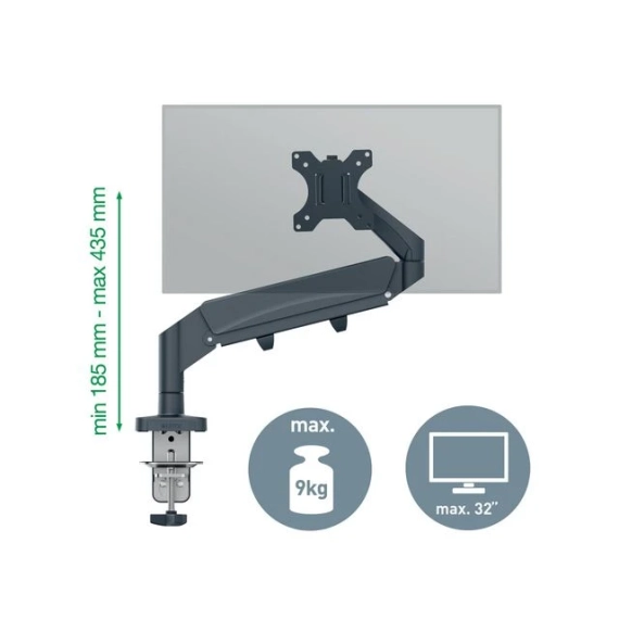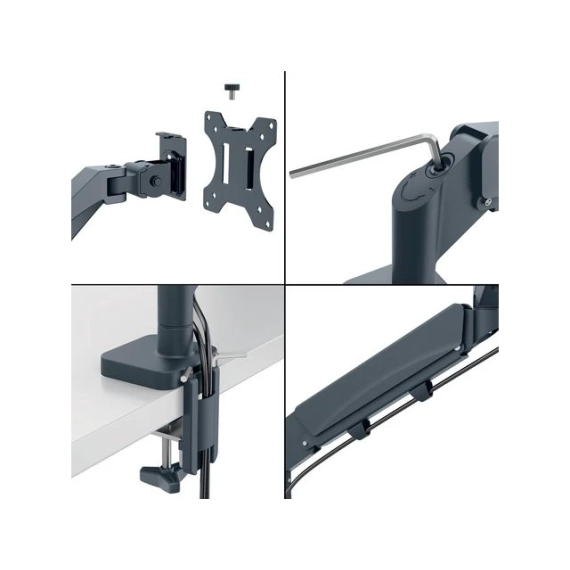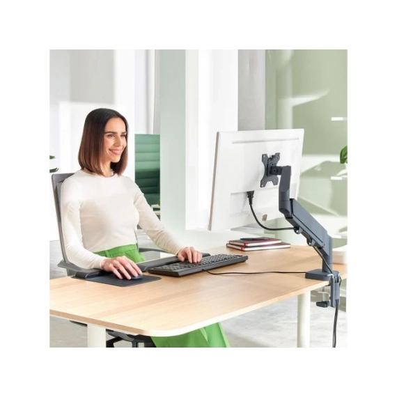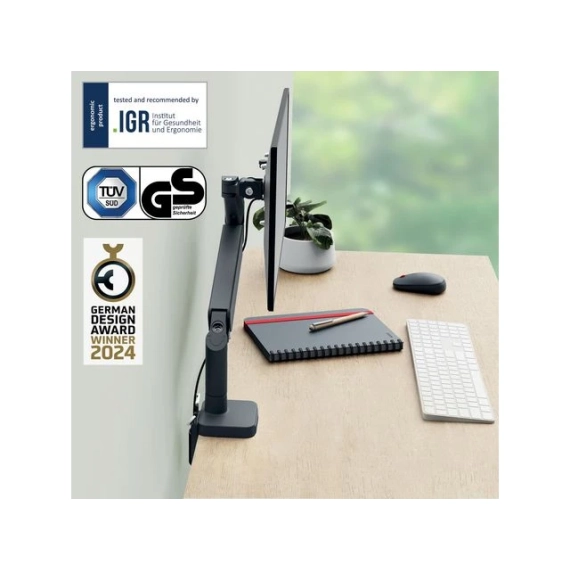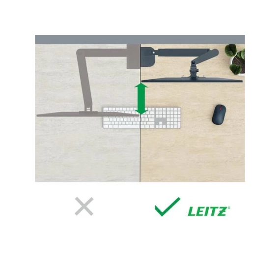 Leitz plassbesparende skjermarm har en positiv innvirkning på kroppsholdningen, fremmer riktig øyejustering og støtter nakke- og skulderkomfort når høyden på skjermen er justert riktig, og som anbefalt, til den ideelle ergonomiske posisjonen. Skjermen forblir stabil i alle høyder og vinkler og kan enkelt byttes mellom liggende og portrettmodus. Dens design er ideell der det er begrenset plass, og det vil frigjøre verdifull plass på skrivebordet. Ergonomisk utformet for å fremme velvære og øke produktiviteten. - Leitz plassbesparende skjermarm har en positiv innvirkning på kroppsholdningen, fremmer riktig øyejustering og støtter nakke- og skulderkomfort når høyden på skjermen er justert riktig, og som anbefalt, til den ideelle ergonomiske posisjonen - Plassbesparende design gjør at den kan monteres også der det er lite plass, uten at det går på bekostning av dybdeskarphet og optimal visuell ergonomi - Fjærassistert enkeltarm for enkelt å justere skjermens høyde (185 mm-435 mm) - Har 180° svingning og skjermrotasjon, +90°/- 90° tilt og tillater justering opp, ned, forover og bakover - Støtter 13'-34' flat eller buet skjerm som veier opp til 9 kg - Enkel å installere med den medfølgende hurtigutløsende avtakbare Vesa®-platen (75 og 100 mm) og silikongummi c-klemme som reduserer vibrasjoner og beskytter skrivebordoverflaten eller ved hjelp av hull (bordtykkelsesområde: 10-80 mm). Verktøy for montering og justeringer inkludert - Kabeladministrasjonssystem holder skjermkabler organisert for et ryddigere arbeidsområde - IGR og TÜV sertifisert