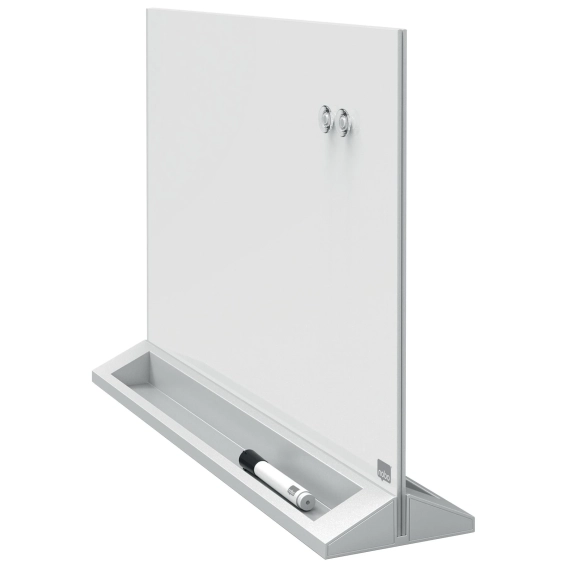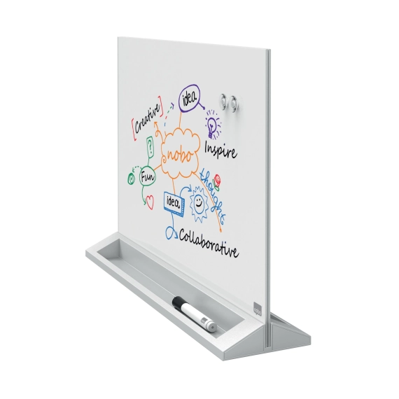 Denne unike Nobo skrivebordstavlen i glass har elegant design og er perfekt for notater. Rammeløs og magnetisk overflate som er meget motstandsdyktig mot riper og skader. Det er bare å skrive og viske ut, eller henge opp små notater. Allsidig og frittstående med dobbel skriveflate. En Nobo penn følger med. - Tosidig tavle av herdet sikkerhetsglass med beste avtørkingsevne. Høy motstand mot blekkflekker, pennemerker, riper og bulker - Leveres med en Nobo whiteboardpenn for glasstavler og et sett med Nobo ekstra kraftige magneter - Skriv eller bruk magneter for å feste notater til den tosidige, magnetiske glassoverflaten - Pennehylle i hele tavlens bredde - 25 års garanti på overflaten - Magnetiske glasstavler krever sporadisk rengjøring å se og yte på sitt beste