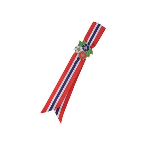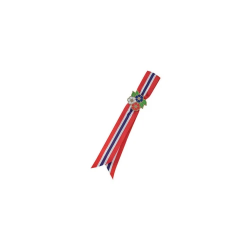 Nydelig 17 Mai sløyfe med både blomst og pin til finstasen. 17. mai barnesløyfe med blomst og pin. Sløyfe med blomsterpin og tre lange bånd i norske flaggs farger. Mål: 12cm - Lengde: 12cm