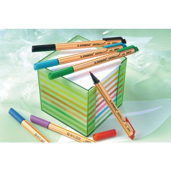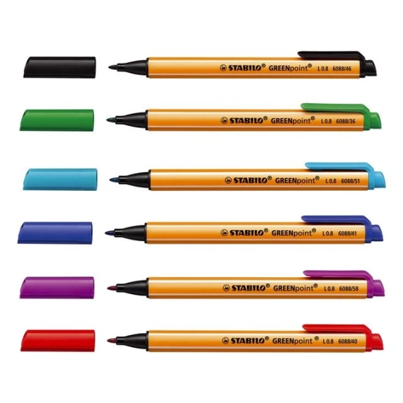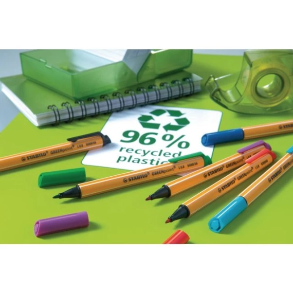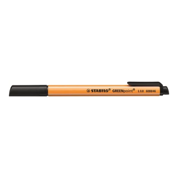 STABILO® GREENpoint®-fiberpennen er laget av 96 % gjenvunnet plast og er det miljøvennlige valget når du vil lage fete linjer og skrift. Denne allsidige fiberpennen fra STABILO® har en stor, solid spiss for markerte strøk, uttrykksfull tekst eller skissering av hoveddetaljer på en side. GREENpoint® er laget av 96 % gjenvunnet plast, og den klassiske stilen suppleres av en ventilert hette med en praktisk lommeklips, slik at du kan bære den med deg. Denne miljøvennlige filtpennen gir en jevn skriveopplevelse på grunn av blekket av høy kvalitet som gir sterke farger og jevne streker. - Miljøvennlig valg - Laget av 96 % gjenvunnet plast - Fiberpenn av høy kvalitet som produserer tydelige linjer med en intens farge - Solid spiss for jevn påføring av blekk - Klassisk stil - Ventilert hette og praktisk lommeklips - Stor spiss - Vannbasert blekk - Strekbredde: 0,8 mm - Farge: Sort
