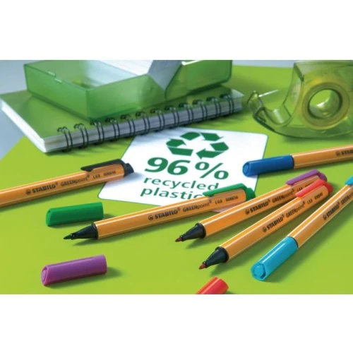 STABILO® GREENpoint®-fiberpennen er laget av 96 % gjenvunnet plast og er det miljøvennlige valget når du vil lage fete linjer og skrift. Denne allsidige fiberpennen fra STABILO® har en stor, solid spiss for markerte strøk, uttrykksfull tekst eller skissering av hoveddetaljer på en side. GREENpoint® er laget av 96 % gjenvunnet plast, og den klassiske stilen suppleres av en ventilert hette med en praktisk lommeklips, slik at du kan bære den med deg. Denne miljøvennlige filtpennen gir en jevn skriveopplevelse på grunn av blekket av høy kvalitet som gir sterke farger og jevne streker. - Miljøvennlig valg - Laget av 96 % gjenvunnet plast - Fiberpenn av høy kvalitet som produserer tydelige linjer med en intens farge - Solid spiss for jevn påføring av blekk - Klassisk stil - Ventilert hette og praktisk lommeklips - Stor spiss - Vannbasert blekk - Strekbredde: 0,8 mm - Farge: Sort