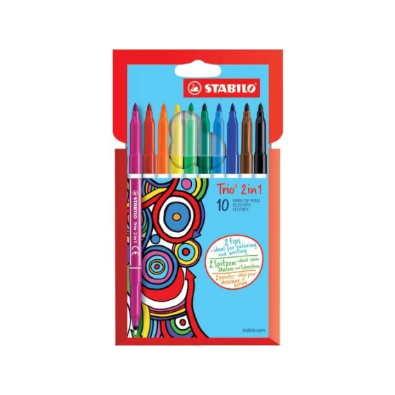 Spar plass og tid med den dobbeltsidige Trio 2in1-pennen som har tips for både skriving og maling. Den har en fin spiss (0,5 mm) som er perfekt til å skrive og skissere med, og en bred spiss (2,0 mm) som er ideell til fargelegging. Korkene kan stables oppå hverandre for å unngå at de går tapt. Pennen har en ergonomisk trekantet grepsone på hver side. Blekket er vaskbart.