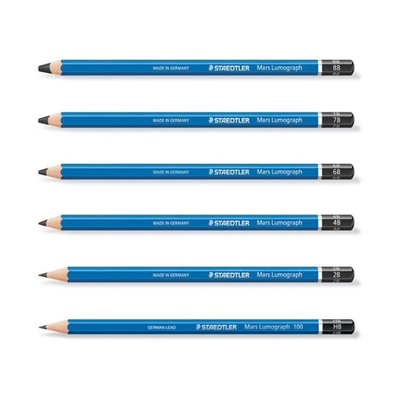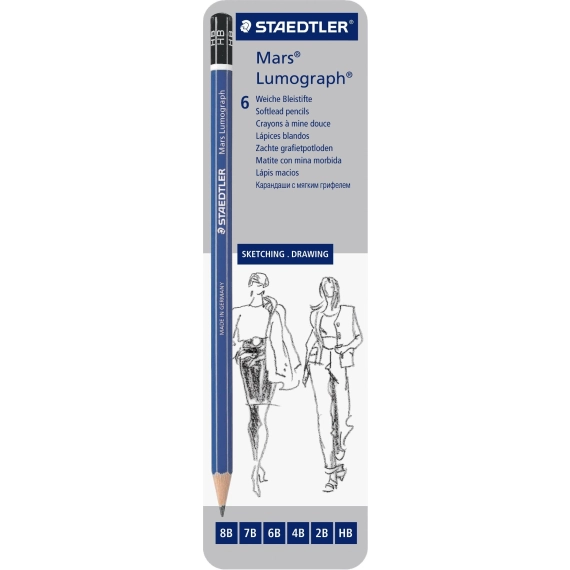 Denne blyanten av høy kvalitet er utformet for å gi utmerkede resultater på både papir og matt film. Den har en ergonomisk sekskantform som er behagelig å gripe. STAEDTLER Mars® Lumograph® 100 har et spesielt bly som er limt til trevirket og dermed er svært slitesterkt. Dette gir blyanten ekstra lang levetid. Blyanten er laget av lett og mykt trevirke som er enkelt å spisse. I tillegg kommer trevirket fra skoger som drives på bærekraftig vis, noe som gjør blyanten til et miljøbevisst alternativ. Det brede utvalget av blygraderinger gjør denne blyanten ideell for grafiske formgivere og kunstnere.