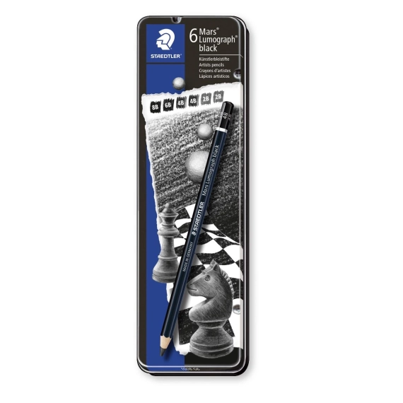 Mars® Lumograph® Sort 100B . Artist-blyanter i Premium kvalitet. Metallesken inneholder 6 blyanter i hardhetsgrader 8B, 6B, 2 x 4B, 2 x 2B. Spesielt bly med karbon for ett matt sort resultat. Spesielt anvendelig til skissetegning og til uttryktsfulle tegninger og portretter. Utroligt bruddsterk på grunn av en spesiel blyformula. Fåes i 4 hardheter: 8B, 6B, 4B, 2B. Stiftdiameter: 8B: 4,5 mm, 6B / 4B / 2B: 3,6 mm • Træ fra PEFC-certificerede skovbrug.