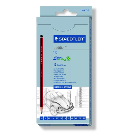 Blyant i Tradition 110 kvalitet. Eske med 12 blyanter i flg. hardheter: 6B, 5B, 2 x 4B, 3B, 3 x 2B, B, HB, H, 2H. Høykvalitets blyant til skriving og skissetegning på papir. Med ekstra forsterket bruddsikkert bly, som er enkelt at viske ut. Tre fra sertifiserte, bærekraftige forvaltede skoger.PEFC-sertifisert.