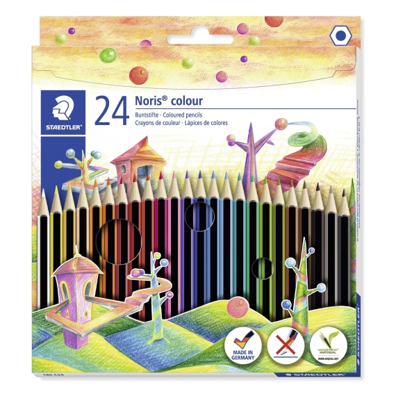 Noris® colour fargeblyant 24 stk. Den første fargeblyanten som er laget av det innovative WOPEX materialet. Tradisjonel sekskantet form. Attraktivt stripe design. Meget god brudd motstand. Markant høyere utnyttelse av materiale fra hvert tre. Produksjonsprosessen er helt fri for løsningsmidler. Ergonomisk bløt overflate. Tre fra PEFC-sertifiserte tyske skoger. 24 stk. assorterte farger. 185 C24.