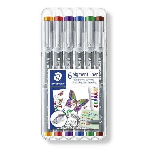 STAEDTLER® Pigment fineliner. Smart STAEDTLER eske laget av plast med 6 blyanter i 6 farger. Fineliner for tegning, skriving og skissering. Lang metallspiss, ideell for bruk med linjaler og maler. Pigmentfarge, arkivbestandig (i henhold til ISO 14145-2), blekes ikke, vannavstøtende. Utviskbar når den brukes på matt tegnefilm, blør ikke igjennom ved overstryking. Linjebredde 0,5 mm.