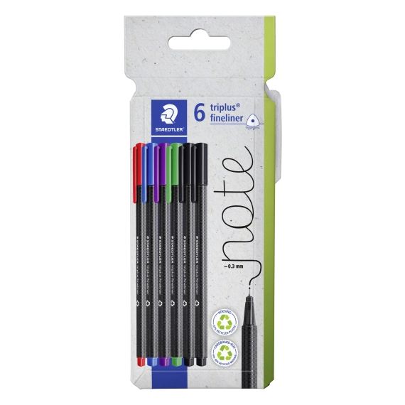 triplus® fineliner 334 Triangular fineliner. •Fineliner with superfine, metal-clad tip. •Ergonomic triangular shape for relaxed and easy writing. •DRY SAFE - can be left uncapped for days without drying up, except neon colours. •Water-based ink. •Washes easily out of most textiles. •PP barrel guarantees long service life. •Housing made of 97 % recycled plastic. •Line width approx. 0.3 mm. Carton box with 6 triplus fineliner in assorted colours