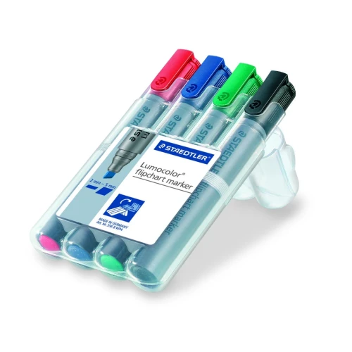 LUMOCOLOR FLIPCHART Merkepenn i høy kvalitet, skrå spiss 2-5mm. Ideel for bruk på papir, vannbaseret tusj som ikke trenger igjennom flipover papiret. Farge intensiv og luktsvak. Tørker på sekunder, og er derfor ideel for venstrehendte brukere. Inneholder DRY-SAFE BLEKK som gjør at den kan ligge uten kork i dagevis uten å tørke ut Perfekt til møtelokalet. Stand-Up STAEDTLER boks. Xylen- og toluen fritt blekk. Refill bar. Inneholder 4 assorterte farger. MADE IN GERMANY