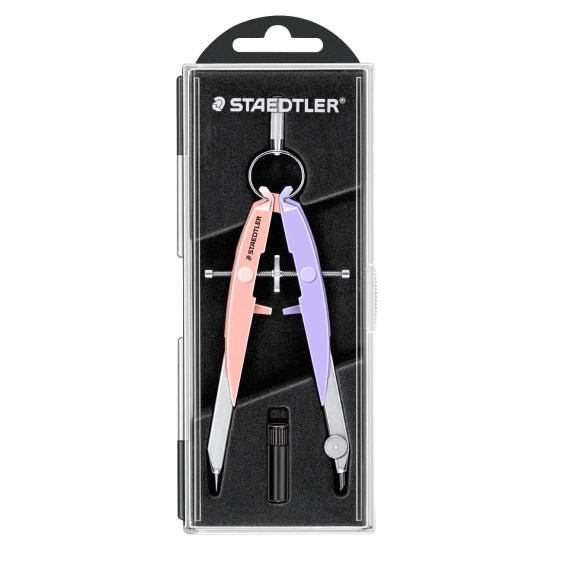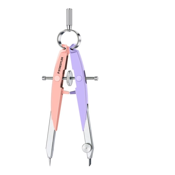 Mars® comfort 556 Precisions geometri passer. Flott pastell farge i lilla/rosa. Senterhjul for hurtig og presis innstilling av radius. Diameter opp til Ø 225 mm. Lengde 154 mm. Robust passer produsert i metall og plast. Utskiftbar nål. Settet inneholder passer og ekstra reservedelsboks.