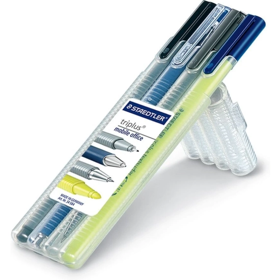 Dette mobile kontorsettet inneholder en fineliner, en kulepenn, en trykkblyant og en merkepenn, alt i en og samme boks. Triplus® Fineliner bruker vannbasert blekk som er tørkesikkert selv om hetten skulle være av i dagevis. Boksen inneholder en Triplus®-kulepenn med en ergonomisk gummikropp som er svært komfortabel å holde i. Triplus® Micro trykkblyant har en kromplettert metallspiss og en kropp med trekantprofil som sikrer lett og avslappet skriving. Settet inneholder dessuten en Triplus® textsurfer