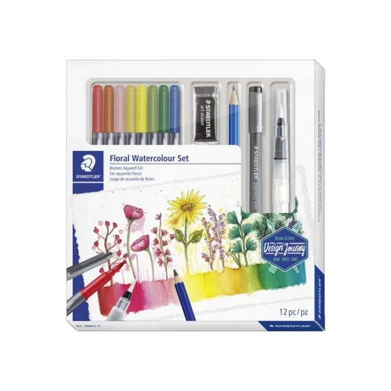 Tegnesett STAEDTLER Floral Watercolour sett Discover & Create Design Journey - Innhold: 8 x 3001 ass. Farger, 1 x 308 01-9, 1 x 100A-4B: 1 x 949-M børste, 1 x 526 B30-9C viskelær.