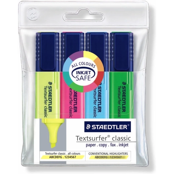 Denne merkepennen bruker en myk skråskåret spiss som skaper variable strekbredder, fra bred til tynn. Dette gjør at du lett kan merke, understreke og skrive. STAEDTLER Triplus® Textsurfer Classic har en stor kropp og blekkbeholder som sikrer lang levetid. Det lysbestandige og pigmentbaserte blekket er utskriftssikkert, noe som betyr at det ikke smitter av på utskrifter. Merkepennen benytter vannbasert neonblekk som tørker raskt, noe som fjerner problemet med avsmitting. Den er spesielt utviklet for bruk på papir, faks og kopier, og er ideell for å fremheve liten skrift. Den kommer dessuten med en lommeklips og hette, noe som er flott for å ta den med deg på farten.