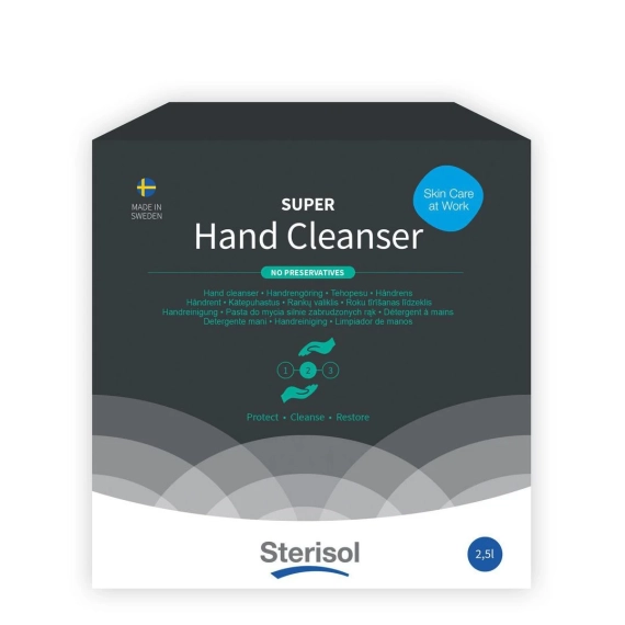 Sterusol SUPER Håndrens er en effektiv, mildt parfymert håndrens som beskytter hudens naturlige barriere. Den inneholder nærende vegetabilske oljer som ikke bare fjerner smuss, men også tilfører fuktighet til huden. Rensen er tilsatt et naturlig friksjonsmiddel utvunnet fra mais, som bidrar til å skrubbe bort gjenstridige urenheter mekanisk. Dette gjør den spesielt godt egnet for miljøer der hendene utsettes for fett, olje, smuss eller andre vanskelige stoffer. - Skånsom håndrens som ikke skader hudens barrierefunksjon - Vegetabilske oljer som løser opp smuss - Ingen konserveringsmidler, fargestoffer, løsemidler - pH-verdi: 7 - Sertifisering: ISO16128 - Brukes sammen med Sterisol dispenser 2,5L