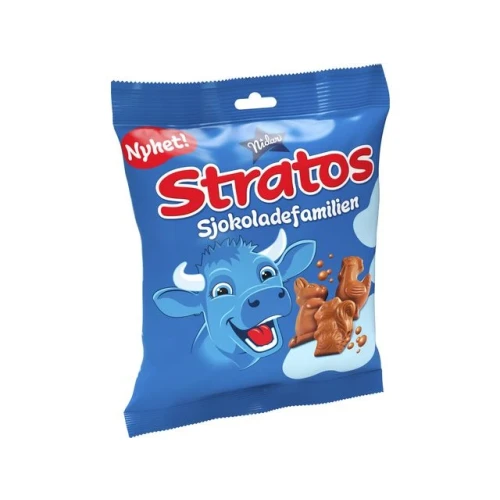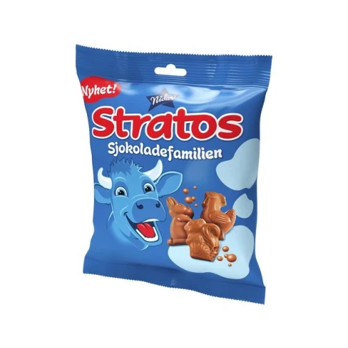 Søte melkesjokoladefigurer, Norges største løsvekt sjokoladebit - nå i pose. Stratos' hemmelighet er luftboblene, som gir den luftige sjokoladen som smelter på tungen. - Vekt: 140g - Allergener: Soya og melk