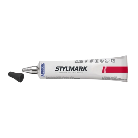 Kuletubemarkør for mange overflater Markal® Stylmark® er en metallkuletupp-markør for markering av de fleste overflater. Klemmetuben i aluminium og den tykke malingen gjør den egnet for ujevne, vertikale og overliggende overflater med utmerket feste på oljete og våte overflater. Xylenfri maling reduserer helserisikoen for bruker. Hodlbar stål-kuletupp markerer med uutslettelig maling på glatte eller ujevne overflater. Stålballtuppen tåler meget ujevne overflater for lang markeringslevetid. Tilbys i 2 størrelser: 3 mm og 6 mm for variert merketykkelse. 11 klare, sterke malingsfarger som er vær- vann- og UV-resistente. Unik maling designet til å ikke dryppe på vertikale eller overliggende overflater. Markeringsområde -20°C til 70°C (-4°F til 158°F). Merketemperatur-resistens: 200°C (392°F). Stålverk og varehus. Smie- og støpeteknikk. Skipsbygging og reparasjon. Metallfremstilling. Metallproduksjon. Konstruksjon. Dekkindustri. Sveising. Industriell produksjon. Bil og annen transport. Bil-