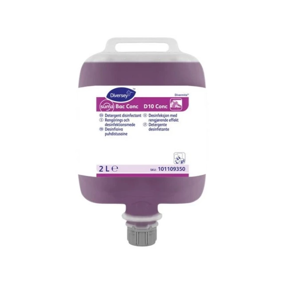 Høykonsentrert desinfeksjonsmiddel med rengjørende effekt. Kan brukes på alle overflater som kommer i kontakt med næringsmidler. Suma Bac Conc D10 er meget effektivt mot et stort antall ulike mikroorganismer. Produktet brukes gjennom Suma Divermite dispenser, som gir nøyaktig dosering hver gang. Desinfeksjonsmidler skal anvendes på forsvarlig vis. - pH-verdi: 11 - Fare- og sikkerhetsinformasjon: - H302 Farlig ved svelging - H315 Irriterer huden - H318 Gir alvorlig øyeskade - H410 Meget giftig, med langtidsvirkning, for liv i vann