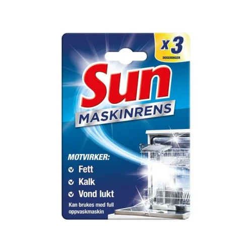 Sun Maskinrens gjør maskinen skinnende ren og motvirker vond lukt, fett og kalk. Tablettene kan brukes sammen med en full oppvaskmaskin. Ren maskin = renere oppvask.