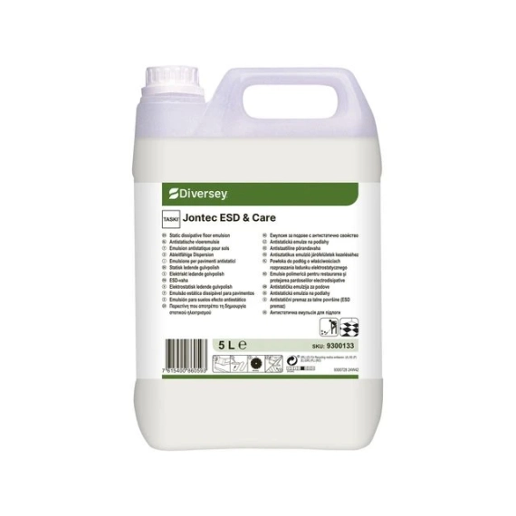 Taski Jontec ESD er en spesialutviklet polish for elektrostatisk ledende gulv/ ESD. Polishen er elektrostatisk ledende, som ivaretar krav til ESD gulv. Er sklisikker i hht. Internasjonale standarder (ASTM-D-2047). Med denne polishen vil det ikke lenger være behov for vedlikehold med Taski Jontec Destat. - pH-verdi: 9 - Fare- og sikkerhetsinformasjon: - H412 Skadelig, med langtidsvirkning, for liv i vann. - EUH 208 Inneholder 1,2-benzisothiazol-3(2H)-on (Benzisothiazolinone), 2, 5-chlor-2-methyl-2H-isothiazol-3-on [EF nr. 247-500-7], blanding (3:1) med 2-methyl-2H-isothiazol-3-on [EF nr. 220-239-6] (Methylchloroisothiazolinone, Methylisothiazolinone), tetraamminezink(2+)-carbonat. Kan gi en allergisk reaksjon.
