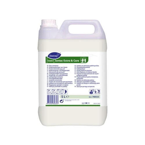 Taski Jontec Extra er en flytende vaskepolish velegnet til grunnbehandling av alle gulv inkludert gummigulv. Kan brukes som kombinert rengjøring og vedlikeholdsmiddel til alle harde gulvbelegg som tåler vann. - pH-verdi: 9 - Fare- og sikkerhetsinformasjon: - H319 Gir alvorlig øyeirritasjon. - H412 Skadelig, med langtidsvirkning, for liv i vann. - EUH 208 Inneholder 1,2-benzisothiazol-3(2H)-on (Benzisothiazolinone) og 2-methyl-2H-isothiazol-3-on (Methylisothiazolinone), 5-chlor-2-methyl-2H-isothiazol-3-on [EF nr. 247-500-7], blanding (3:1) med 2-methyl-2H-isothiazol-3-on [EF nr. 220-239-6] (Methylchloroisothiazolinone, Methylisothiazolinone), tetraamminezink(2+)-carbonat. Kan gi en allergisk reaksjon.