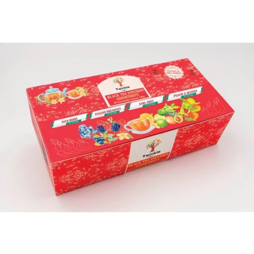 Sort te med 4 ulike smaker - skogsbær, English breakfast, Earl Grey og fersken/mango. 20 poser av hver smak. - Individuelt innpakkede teposer - Antall teposer: 80stk - Vekt: 120g - Koffeinfri: nei.