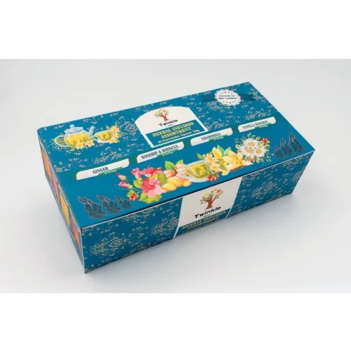 Urtete med 4 ulike smaker - ingefær, nype/hibiscus, kamomille og vanilje rooibos. 20 poser av hver smak. - Individuelt innpakkede teposer - Antall teposer: 80stk - Vekt: 120g - Koffeinfri: Variantene nype/hibiscus, kamomille og vanilje rooibos inneholder ikke koffein.