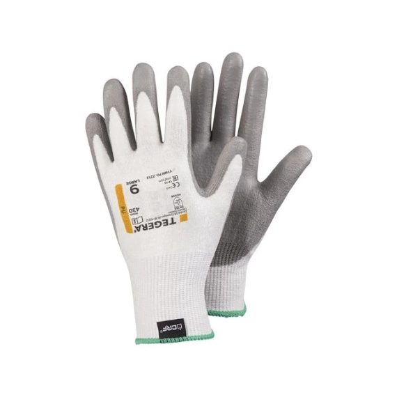 TEGERA 430, populær kuttbeskyttelseshanske for en rekke bruksområder. En kombinasjon av høy komfort, fleksibilitet og middels kuttbeskyttelse takket være designen og CRF®-teknologien. Pustende håndbak og grått PU-belegg i håndflaten med jevn finish gir et godt grep på tørre til lett fuktige overflater. - Grep design: Glatt overflate - Fôrmateriale: 13 gg, CRF®-teknologi, HPPE, Nylon, Spandex - Farge: Grå, hvit - Standarder og merking: Cat.II, CE merket, EN ISO 21420:2020, EN 388:2016+A1:2018 4X42B