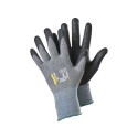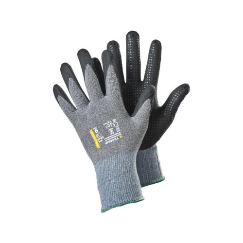 Fleksibel og myk strikket 15 gg syntetisk hanske, håndflatedyppet med nitrilskum og nitrilknotter for utmerket grep. Berøringsskjermfunksjon. Perfekt for presisjonsarbeid, finmonteringsarbeid, inspeksjonsarbeid og andre lette oppgaver i tørre og fuktige miljøer. Tåler kontaktvarme opp til 100 °C. Hudvennlig med Derma-test og Oeko-Tex-sertifikat. - Type: Varmebeskyttende hansker, Arbeidshansker for presisjonsarbeid - Grepdesign: Prikkete - Fôrmateriale: 15 gg, Nylon, Spandex - Farge: Sort, grå - Standarder og merking: Cat.II, EN 407:2020 X1XXXX, EN ISO 21420:2020, EN 388:2016+A1:2018 4131A