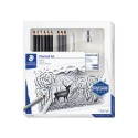 Tegnesett STAEDTLER grafitt Lumograph karbon blyant. Discover & Create Design Journey - Innhold: 1 x 100B-HB, -2B, -4B, -6B, -7B, -8B: 1 x 100C-S, -M, -H: 1 x 5426 (nr. 4) stykke, 1 x 5427 knokegummi , 1 x 510 25-C blyantspisser - Finn tips og triks på emballasjen