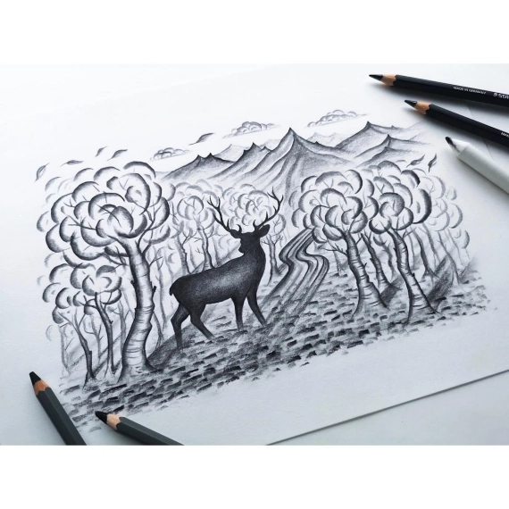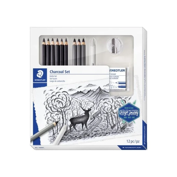 Tegnesett STAEDTLER grafitt Lumograph karbon blyant. Discover & Create Design Journey - Innhold: 1 x 100B-HB, -2B, -4B, -6B, -7B, -8B: 1 x 100C-S, -M, -H: 1 x 5426 (nr. 4) stykke, 1 x 5427 knokegummi , 1 x 510 25-C blyantspisser - Finn tips og triks på emballasjen