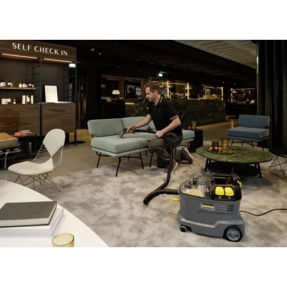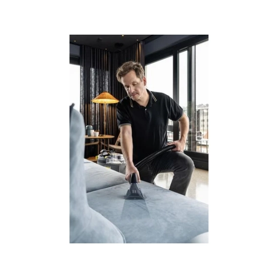 Puzzi 8/1 er en robust, slitesterk og effektiv møbel- og tepperenser som renser møbeltrekk og fjerner flekker fra tekstiloverflater med hygienisk rengjøringsresultat og høy effektivitet. Den kompakte maskinen sprayer rengjøringsløsningen dypt inn i tekstilfibrene og fjerner den deretter igjen sammen med løsnet skitt. Den utmerkede oppsugingsytelsen sørger også for rask tørking og gjør at tekstiloverflatene raskt kan brukes igjen - ideelt for de høye kravene til rengjøringspersonell i hotellsektoren eller innen rengjøring av kjøretøy. Det ekstra korte møbelmunnstykket for praktisk, ergonomisk rengjøring av trange områder følger med som standard. Den svært lave vekten og det ergonomiske bærehåndtaket gjør maskinen enkel å frakte med seg. Store trykknapper som kan betjenes for hånd eller fot øker også brukervennligheten. Lokket og håndmunnstykket er gjennomsiktige for bedre oversikt over det skitne vannet. Sprøyteslange: 2.5 m Strømkabel: 7.5 m Store bakhjul og fleksible 360° styrehjul Avtakbar, smart 2-i-1 beholder