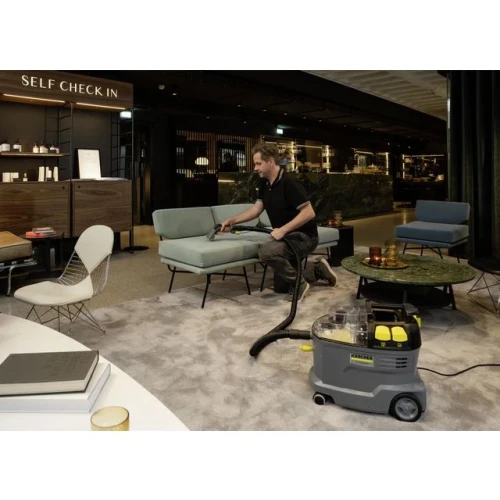Puzzi 8/1 er en robust, slitesterk og effektiv møbel- og tepperenser som renser møbeltrekk og fjerner flekker fra tekstiloverflater med hygienisk rengjøringsresultat og høy effektivitet. Den kompakte maskinen sprayer rengjøringsløsningen dypt inn i tekstilfibrene og fjerner den deretter igjen sammen med løsnet skitt. Den utmerkede oppsugingsytelsen sørger også for rask tørking og gjør at tekstiloverflatene raskt kan brukes igjen - ideelt for de høye kravene til rengjøringspersonell i hotellsektoren eller innen rengjøring av kjøretøy. Det ekstra korte møbelmunnstykket for praktisk, ergonomisk rengjøring av trange områder følger med som standard. Den svært lave vekten og det ergonomiske bærehåndtaket gjør maskinen enkel å frakte med seg. Store trykknapper som kan betjenes for hånd eller fot øker også brukervennligheten. Lokket og håndmunnstykket er gjennomsiktige for bedre oversikt over det skitne vannet. Sprøyteslange: 2.5 m Strømkabel: 7.5 m Store bakhjul og fleksible 360° styrehjul Avtakbar, smart 2-i-1 beholder