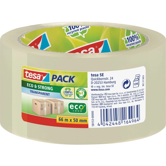 Ny miljøvennlige Eco & Strong emballasjetape. Kraftig PP-forsterking laget av 100 % resirkulert plast.