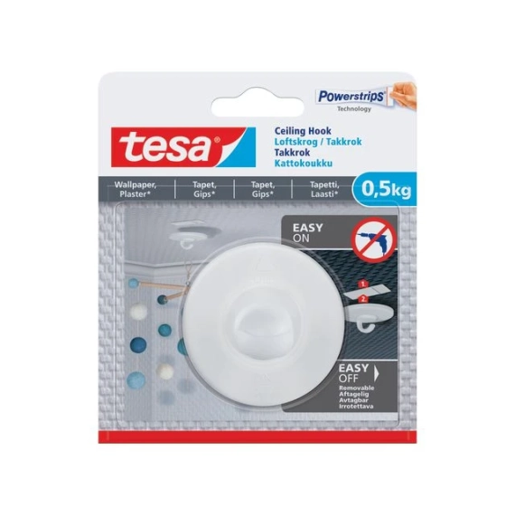 tesa® Adhesive Ceiling Hook for WÅ sette opp en baby-uro er lett takket være den selvklebende takkroken fra tesa®. Den største fordelen med limkroken er at du ikke behøver boremaskin. Det er mulig ved hjelp av den gjennomprøvde Powerstrips-teknologien. På sarte overflater som tapet og gips har den en bærekraft på opptil 0,5 kg. Teknologien gjør det mulig å fjerne kroken uten å etterlate spor, mens du samtidig kan bruke den på nytt (med en ny limstrimmel). Den hvite takkroken av plast har et dreibart krokhode. Kroken dekker limstrimmelen slik at den ikke kan ses.allpaper, up to 0.50 kg