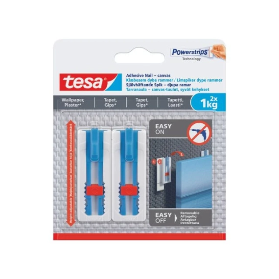 tesa® selvklebende strimler for tapet og gips 1 kg. Refillpakke for gjenbruk av tesa® limspikrer for tapet og gips 1 kg. Et spesielt limsystem med en skumkjerne gjør at strimmelen optimalt kompenserer for ujevnheter i de fleste strukturerte og ømfintlige overflatene. Designet for bruk på tapet og gips for å sikre langvarig og sikkert grep uten behov for en hammer eller boremaskin. Powerstrips-teknologi betyr at det er mulig å henge opp bilder eller andre dekorasjoner og deretter fjerne dem lett uten å skade overflaten. Bruk alltid i kombinasjon med en tesa® limspiker. - or teksturerte og sensitive overflater som tapet eller gips - For gjenstander opptil 1 kg1 per spiker eller 2 kg ved hjelp av 2 spikrer - Kan fjernes uten å etterlate merker - Gjenbrukbar med en ny strimmel - For optimale resultater kan du lese instruksjonsheftet