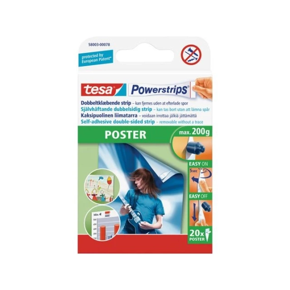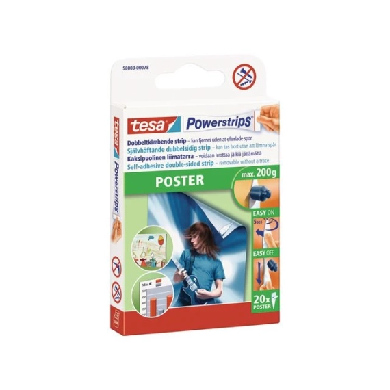 Disse selvklebende tesa® Powerstrips® er enkle å bruke og er ideelle for å feste plakater. Du kan også flytte eller fjerne dem raskt og enkelt. Tesa Powerstrips® POSTER monteringsstrimler har en langvarig klebeeffekt og vil sikkert holde plakater eller skilt i hjemmet eller på kontoret. De er også enkle å flytte eller fjerne takket være Powerstrips®-teknologien og etterlater ingen klebrige rester eller skadde overflater. Dra i skumfliken for å strekke strimmelen. Den vil da løsne fra overflaten. Du slipper å bruke verktøy, skruer og spiker, så du trenger ikke å bekymre deg for å lage skjemmende hull i veggen. Hver pakke inneholder 20 strimler. De fungerer best på jevne, støvfrie overflater og kan bære plakater på opptil 200 g. - Ideell for bruk på plakater eller lette skilt på kontoret eller hjemme - Dobbeltsidige selvklebende strimler - Kan enkelt flyttes eller fjernes - Ingen limrester - Du slipper å lage hull i veggen - Du trenger ikke å bruke drill, skruer eller spiker - Kapasitet på 200 g - Farge: Hvit - Pakke med 20