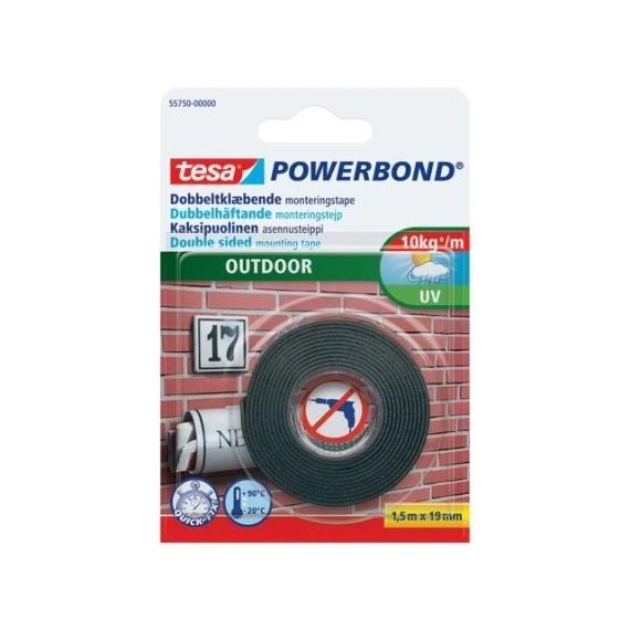 tesa® Powerbond Outdoor er en dobbeltsidig monteringstape for reparering av ting som husnumre på faste overflater, også utendørs. Enkel å bruke, og det trengs ingen andre verktøy enn en saks. Et permanent, sterkt hold som under optimale forhold betyr at en enkelt 10 cm tapebit kan holde opp til 1 kg.