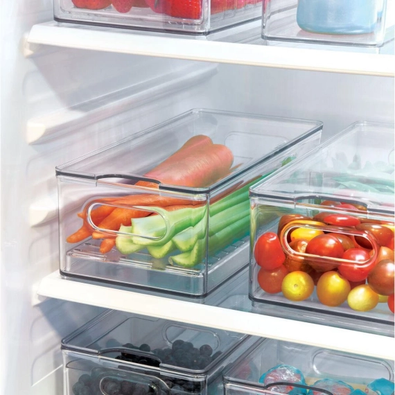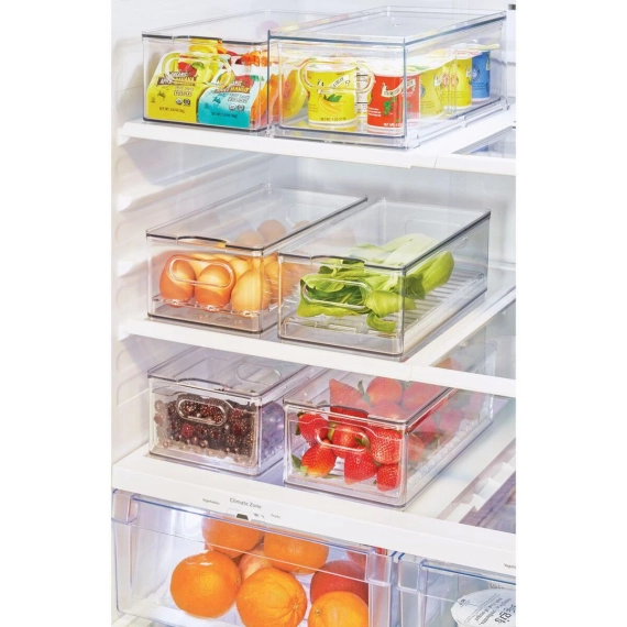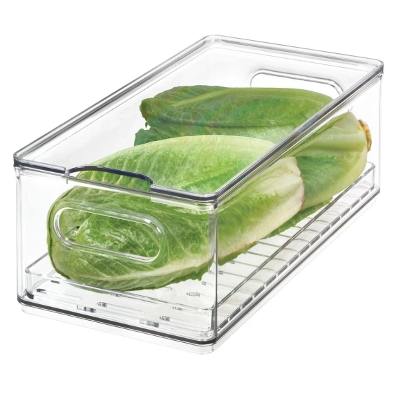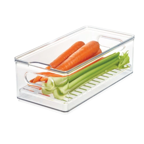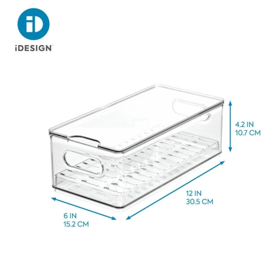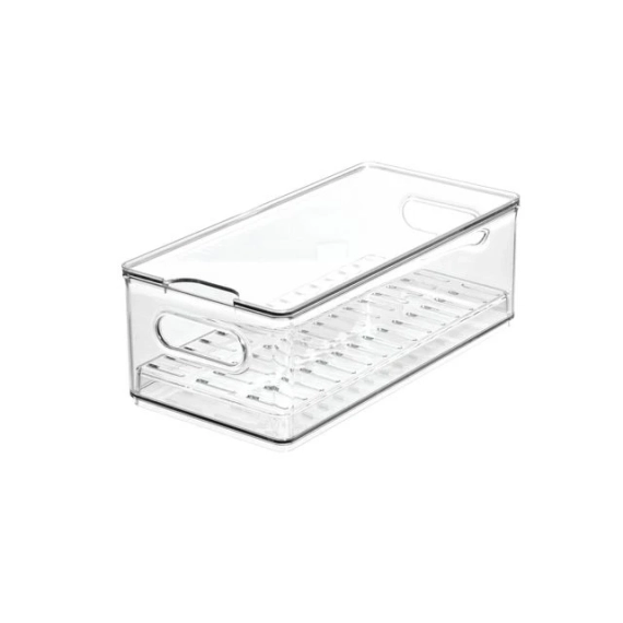 The Home Edit kolleksjon oppbevaringsboks til kjøleskap, med lokk og brett til drenering, for å holde fuktighet borte og samtidig bevare friskheten av råvarene som frukt og grønt oppbevart. Perfekt modulær for å få mest mulig ut av kjøleskap, denne oppbevaringsboksen er helt klar, slik at innholdet alltid er synlig og du alltid vil ha en oversikt over hva det er du faktisk har i kjøleskapet. - Integrerte håndtak gjør det enkelt å gripe boksen og ta ut - Hver oppbevaringsboks er ekstremt holdbar og kan sikkert stables i sammen andre oppbevaringsbokser fra The Home Edit serien til kjøleskapet - Dreneringsbrettet fjernes for enkel rengjøring eller for bruk som dørslag i full størrelse - Tåler ikke oppvaskmaskin - Mål ca. 15x30x10,5cm