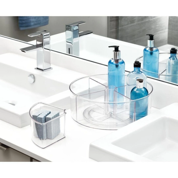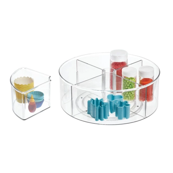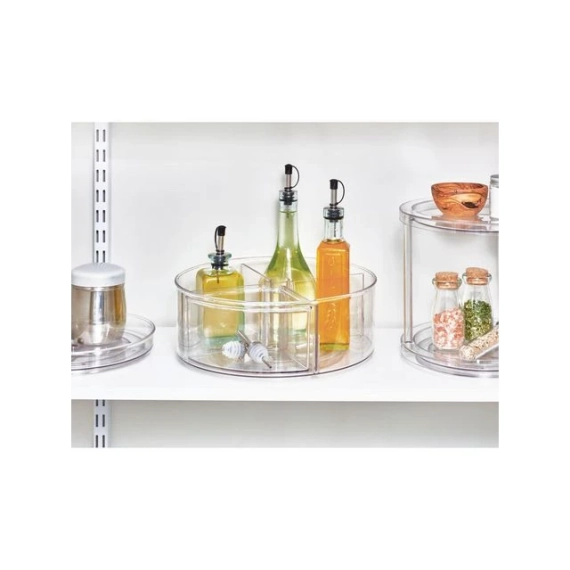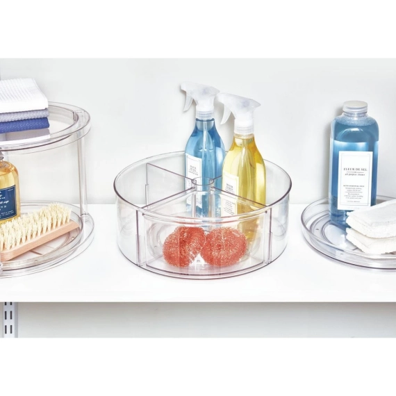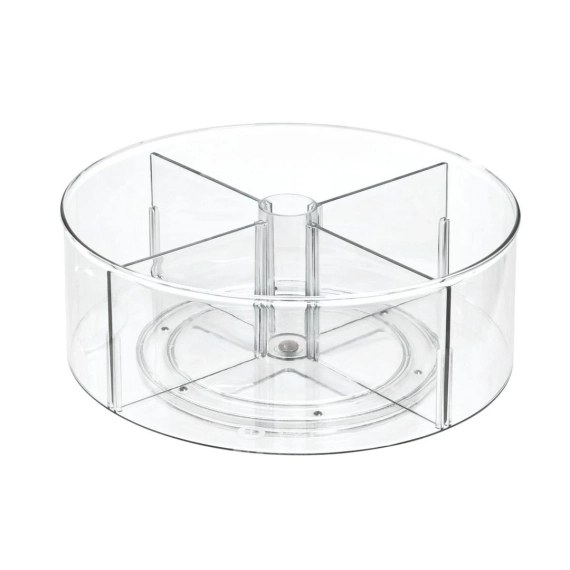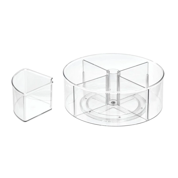The Home Edit kolleksjon tilpass din «Lazy Susan» etter ditt behov og oppdag hemmeligheten til uanstrengt organisering. De avtakbare skilleveggene lar deg sortere og oppbevare alt fra krydderier, macaroni og snacks, til verktøy og rengjøringsmidler. - Bestående av flyttbare inndelinger som holder flasker og løse gjenstander oppreist, slik at alt innhold alltid er lett å se og hente ut, i tillegg til at den roterer 360° - Usedvanlig slitesterkt, med et klart, rent utseende som er perfekt for et organisert skap, skuff og pantry - Laget av hard, slitesterkt og klar Resipreme- plast - Inkluderer en flyttbare oppbevaringsboks og fire avtakbare skillevegger - Tåler ikke oppvaskmaskin - Høyde ca 11cm